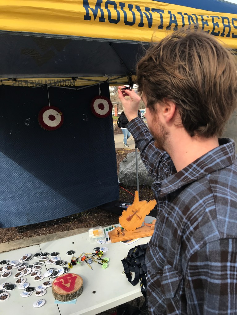 The WVU Forestry Club’s tent set up outside of the Mountainlair, in order to raise awareness and recruit members for their club.Members of the WVU Forestry Club show off a poster with their information in the attempt to attract new members.Freshman, Christian Crone, attempts to win free Chick-fil-A from the WVU Forestry Club by playing darts.The WVU Forestry Club handed out pins with their logo to students as they passed by the Mountainlair.The WVU Forestry Club shows off their sculpture, made from a hacksaw, two chainsaws, and a tree trunk.